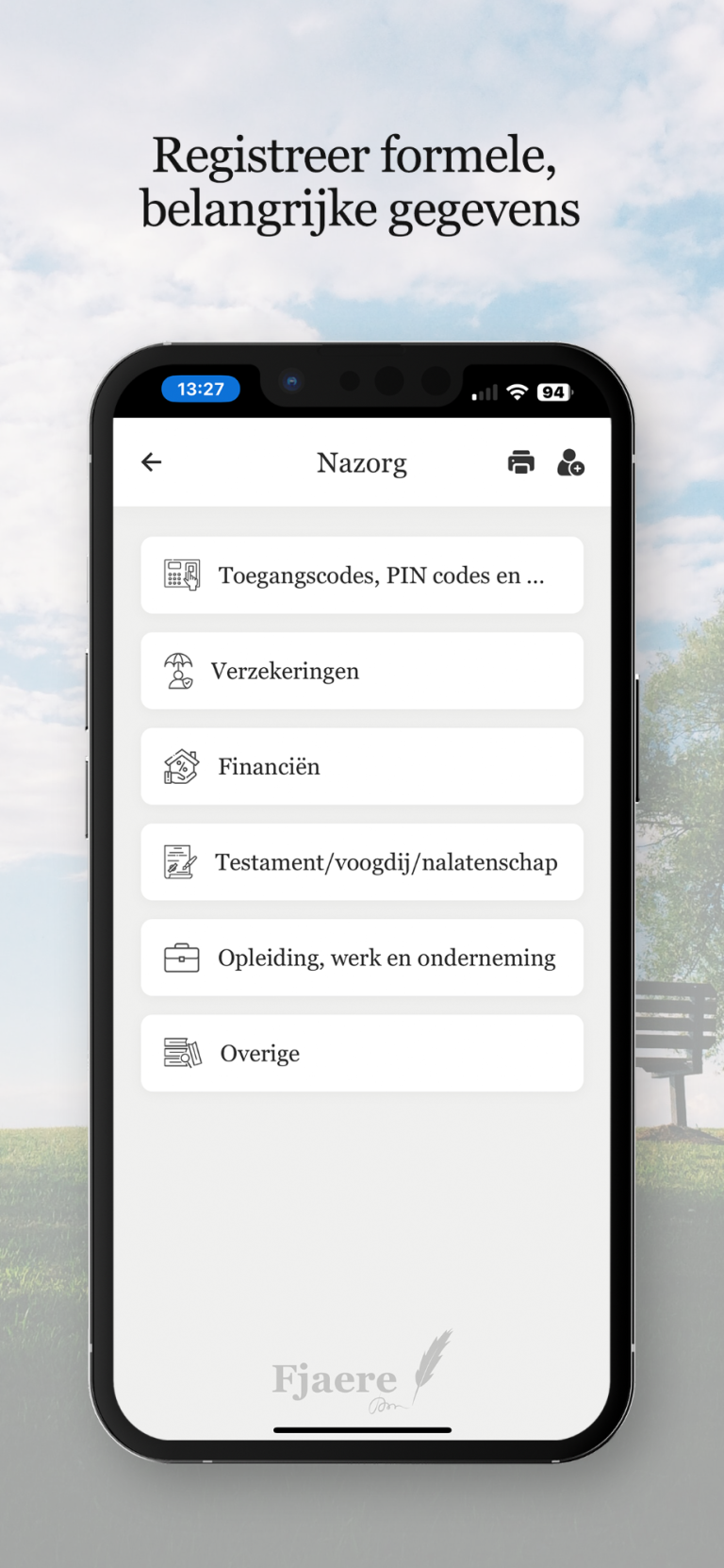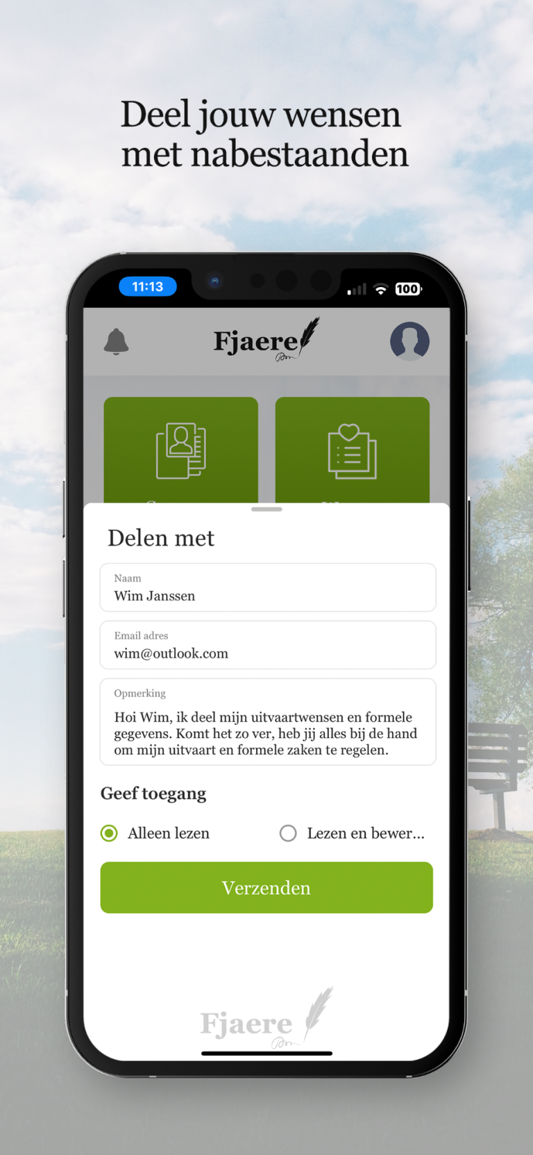 Fjaere helpt je stap voor stap vast te leggen wat jij belangrijk vindt rondom overlijden, uitvaart en formele zaken - veilig en overzichtelijk op één plek.